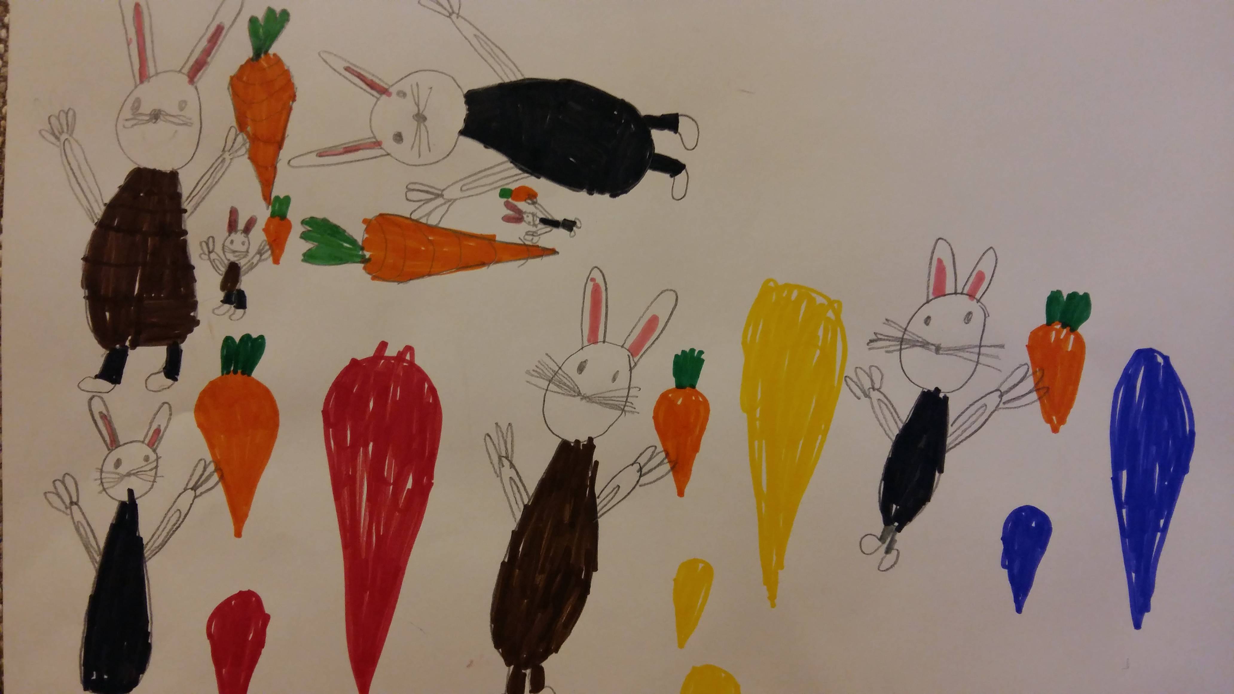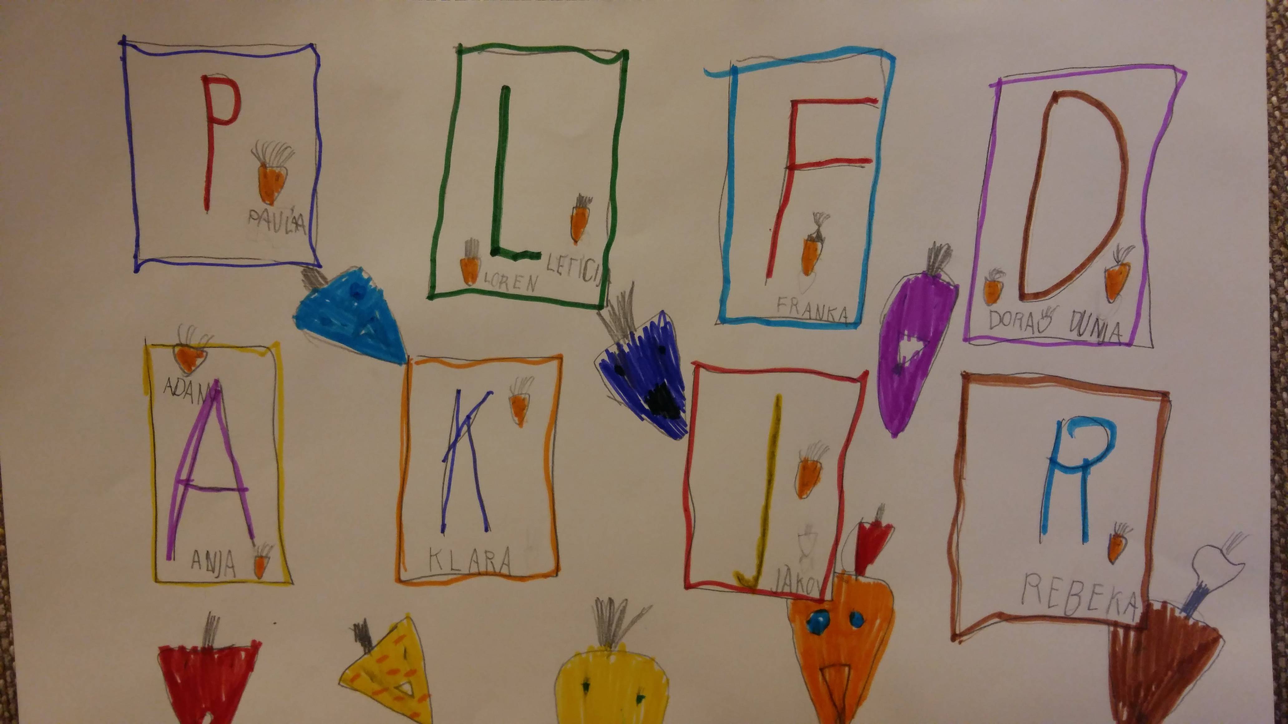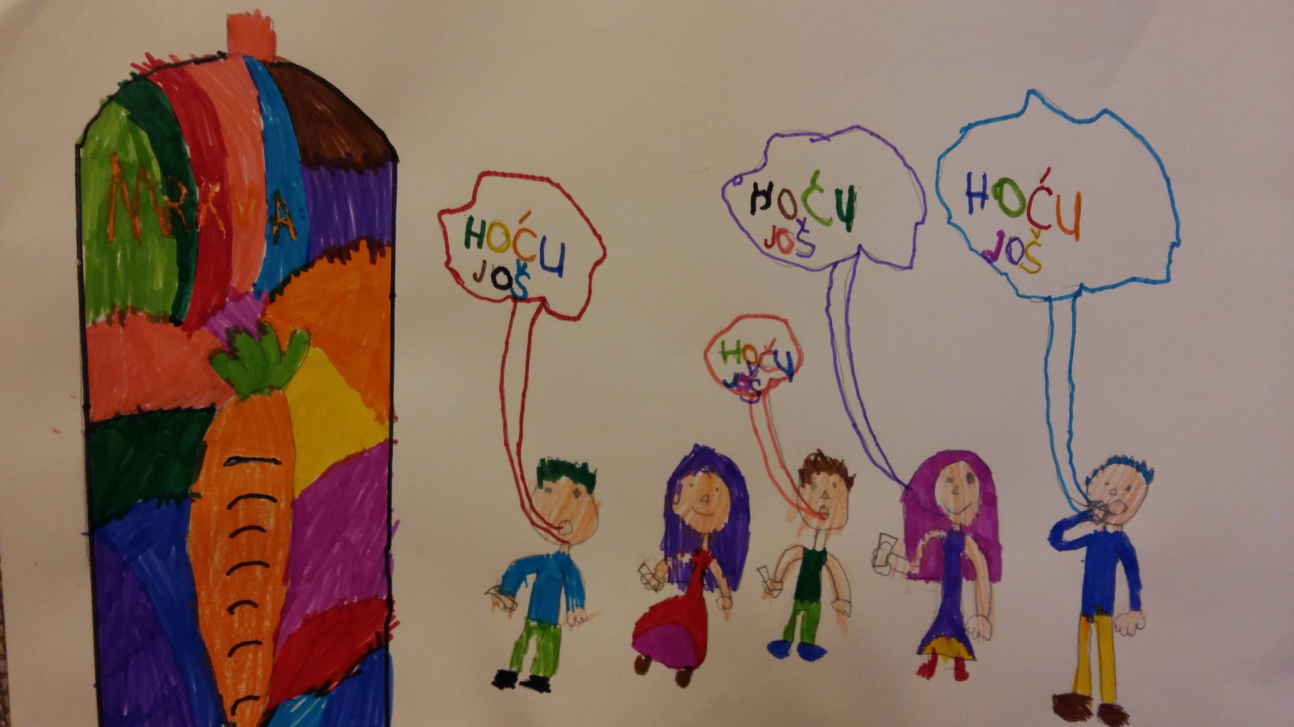 Glavni lik je razredni simbol „mrkvica“, a dječja mašta je priču provlačila od mrkvi u različitim bojama , povrća koje se veselo gurka u juhi , do mrkvica s različitim „frizurama“. Zaključili smo da su sve mrkvice iste, a različite; i visoke i niske se mogu zajedno loptati; i šutljive i brbljave mogu zajedno crtati...Zatim smo crteže digitalno preradili uz pomoć informatičara Nikole Pavčeca. Evo nekoliko likovnih i digitalnih kadrova.