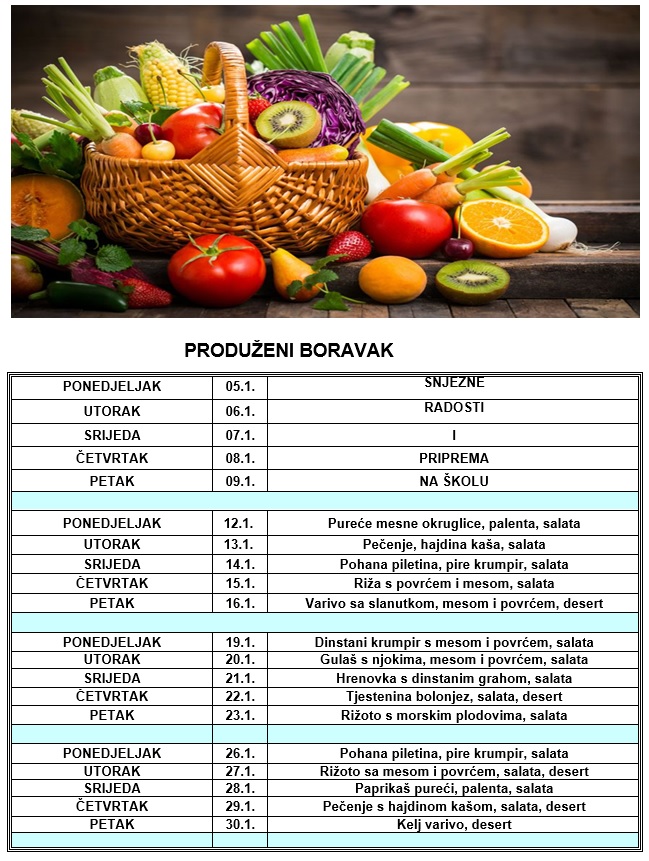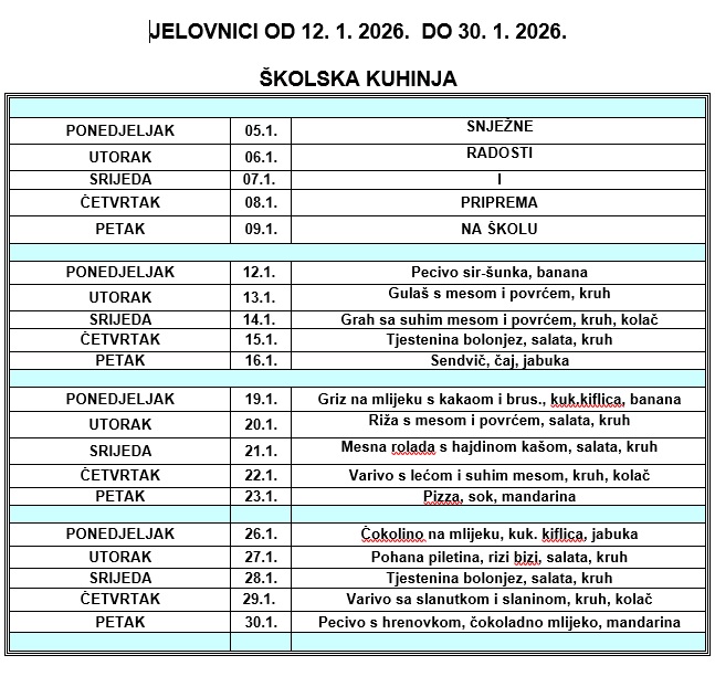 Aktualni jelovnici po mjesecima: SIJEČANJ 2026. JELOVNIK ŠKOLSKA KUHINJA PROSINAC JELOVNIK PRODUŽENI BORAVAK PROSINAC